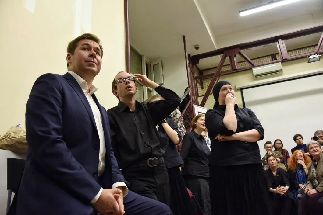В зале «Международного Мемориала» узнали о том, что в Театр.doc пришла полиция. Они смеются: «Ошиблись залом». Премьера спектакля о чеченском правозащитнике Оюбе Титиеве состоялась в «Мемориале». Фото: Виктория Одиссонова/ «Новая газета»