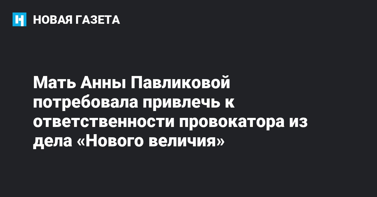 Юлия Павликова, мать 18-летней фигурантки дела «Нового Величия» Анны Павликовой, подала заявление в прокуратуру и Следственный комитет с требованием привлечь к ответственности свидетеля по делу Руслана Д., который, предположительно, является сотрудником правоохранительных органов и был внедрен в группу молодых людей, обвиняемых в создании экстремистского сообщества. Копия заявления имеется в распоряжении «Новой газеты».