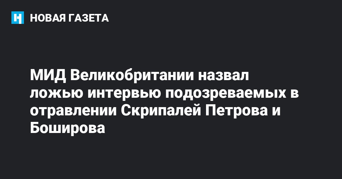 Министерство иностранных дел (МИД) Великобритании назвало интервью Руслана Боширова и Александра Петрова, подозреваемых в отравлении экс-сотрудника ГРУ Сергея Скрипаля и его дочери Юлии в Солсбери, «запутыванием вопроса и ложью». Об этом со ссылкой на представителя британского ведомства сообщает РИА Новости.