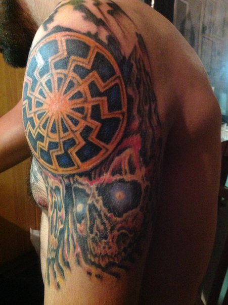 Тауировки Женьке, с орлом и тризубом, я сам набивал, еще в 2007 году, а черное солнце относительно недавно сделано. Он увлекался мифологией, обожал рунические символы.