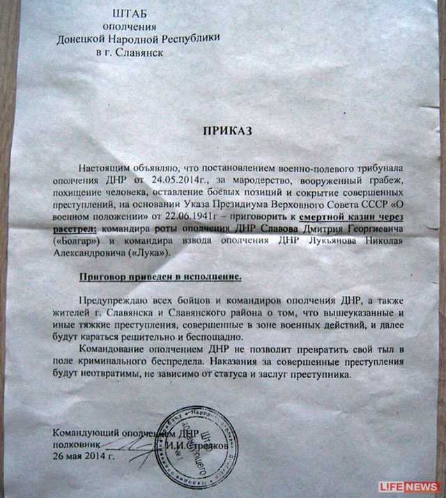 Подлинность «расстрельных приказов» косвенно подтверждал и сам Стрелков-Гиркин — в интервью РИА Новости в мае 2014 года он заявил о расстреле Дмитрия Славова и Николая Лукьянова «за мародерство, вооруженный грабеж, похищение человека, оставление боевых позиций».