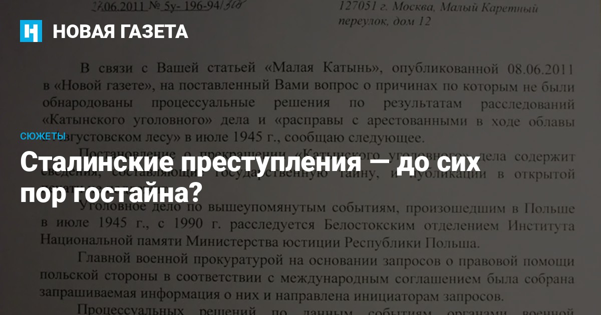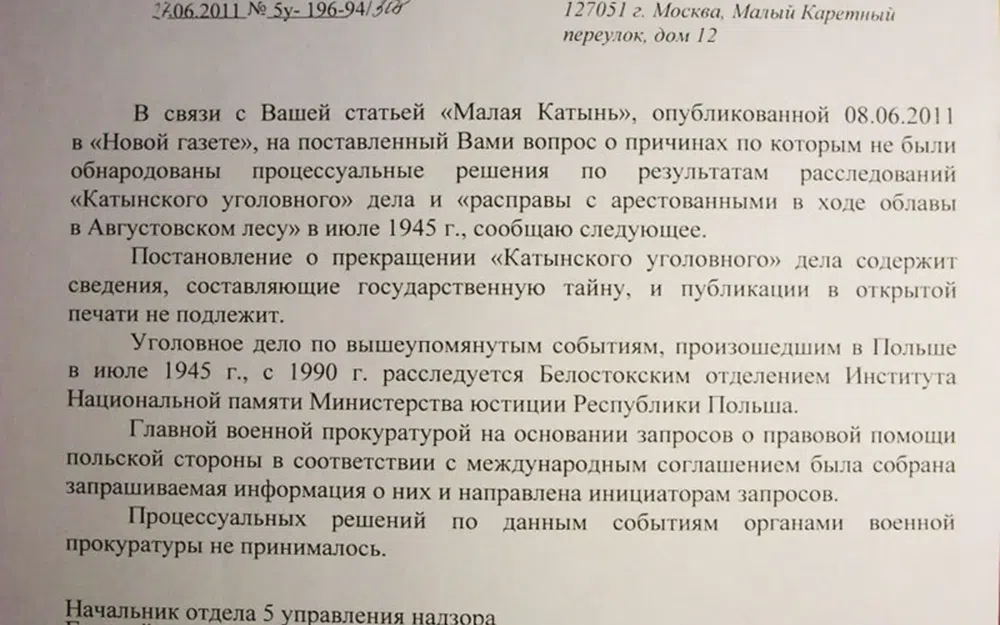 Опубликованный «Новой газетой» в номере от 8 июня с.г. фрагмент архивного документа от 21 июля 1945-го с изложением плана предстоящего убийства 592 арестованных поляков убедительно свидетельствует, что органами военной контрразведки СМЕРШ было совершено преступление против правосудия. Без суда и следствия были убиты арестованные польские граждане. Разве этого факта недостаточно, чтобы возбудить расследование преступления?